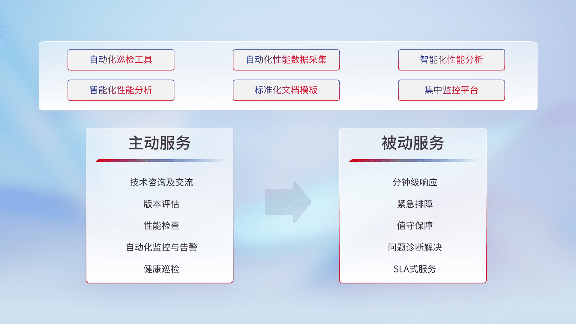 智能化工具和标准化文档,,,,保障服务质量,,,,提供主动服务(包含技术咨询、、版本评估、、性能检查、、、、自动化监控与告警、、、健康巡检)和被动服务包含(分钟级响应、、、紧急排障、、值守保障、、问题诊断解决、、SLA服务)。。